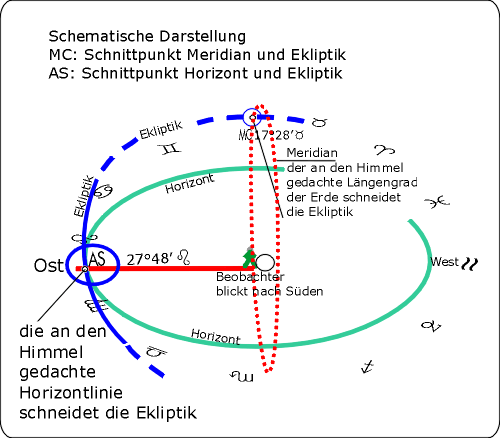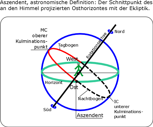 „Der Aszendent gehört mit der astronomischen Länge des Geburtsortes zu einem anderen System, und zwar zu dem des Erdlaufs um die Sonne. Es verbindet daher die Häuser der Erde mit den Häusern des Aszendenten."