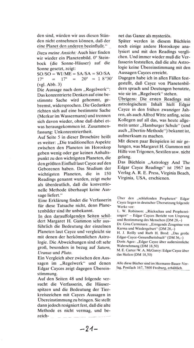 Auf den Seiten 48 und folgende versucht die Verfasserin die Häuserspitzen und Bedeutung der Tierkreiszeichen mit Cayces Aussagen in Übereinstimmung zu bringen. Sie stellt dann jedoch resigniert fest, das die orthodoxe Methode es nicht vermag und bezeichnet das Ganze als mysteriös.